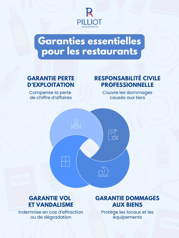 L’assurance multirisque pour les restaurants et brasseries repose sur plusieurs garanties clés, destinées à couvrir les principaux risques auxquels les restaurateurs sont confrontés.